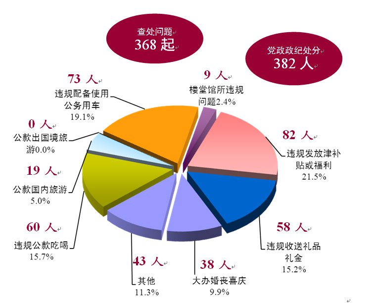 分问题看。在查处的各类问题中,“违规发放津补贴或福利”问题最为突出,处分82人,占处分人数的21.5%;居第二位的“违规配备使用公务用车”问题,处分73人,占19.1%;居第三位的“违规公款吃喝”问题处分60人,占15.7%。