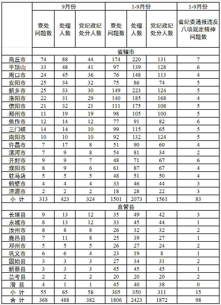 当前位置:驻马店网络问政 > 政务要闻 > 正文9月份,全省各级纪检监察机关继续深入贯彻落实中央、中央纪委要求,持之以恒纠正“四风”,全省共查处违反中央八项规定精神问题368起,处理488人,其中党纪政纪处分382人;处分人数中乡科级干部368人,县处级干部14人。