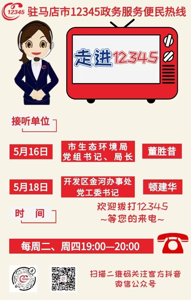 当前位置:驻马店网络问政 > 12345热线 > 正文按照《驻马店市人民政府办公室关于建立市直单位现场接听12345热线电话制度的通知》(驻政办明电〔2019〕103号)、《驻马店市12345政务服务便民热线中心关于2023年5月份市直单位、中心城区区直单位及乡镇(街道)现场接听12345热线电话的通知》(驻热线文〔2023〕5号)相关要求,5月16日晚市生态环境局党组书记、局长董胜昔,5月18日晚开发区金河办事处党工委书记顿建华将现场接听12345热线电话,欢迎广大市民就相关问题来电。