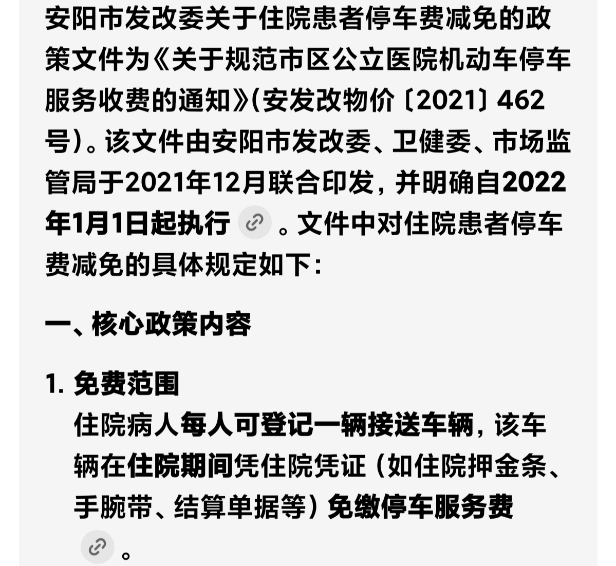 | 留言内容 | 早在2022年 安阳市发改委、卫健委、市场监管局于2021年12月联合印发并明确2022年1月1日起执行的《关于规范市区公立医院机动车停车服务收费的通知》(安发改物价〔2021〕462号) 。该文件明确规定,住院病人每人可登记一辆接送车辆,该车辆在住院期间免缴停车服务费 。 住院患者在医院住院治疗本身已经承担了医疗费用等经济负担,医院作为公益性质的机构应尽量为住院患者提供便利,免收住院患者的停车费用能够减轻患者的经济与精力负担,提升就医的便利性与体验,彰显医院公益属性与人文关怀,也更能有效的传递民生温度。建议驻马店市以及辖区各个县城的医院能够向安阳市学习,促进驻马店的发展,让广大患者体现来自于驻马店的爱。