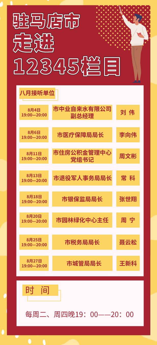 按照《驻马店市人民政府办公室关于建立市直单位现场接听12345热线电话制度的通知》(驻政办明电〔2019〕103号)、《驻马店市12345市长热线服务中心关于启动2020年市直单位现场接听12345热线电话活动的通知》(驻热线文〔2020〕2号)相关要求,结合近期群众关心关注的热点难点问题,本月将由市中业自来水有限公司、市医疗保障局、市住房公积金管理中心、市退役军人事务局、市银保监局、市园林绿化中心、市税务局、市城管局,八个单位主要负责同志现场接听12345热线电话。